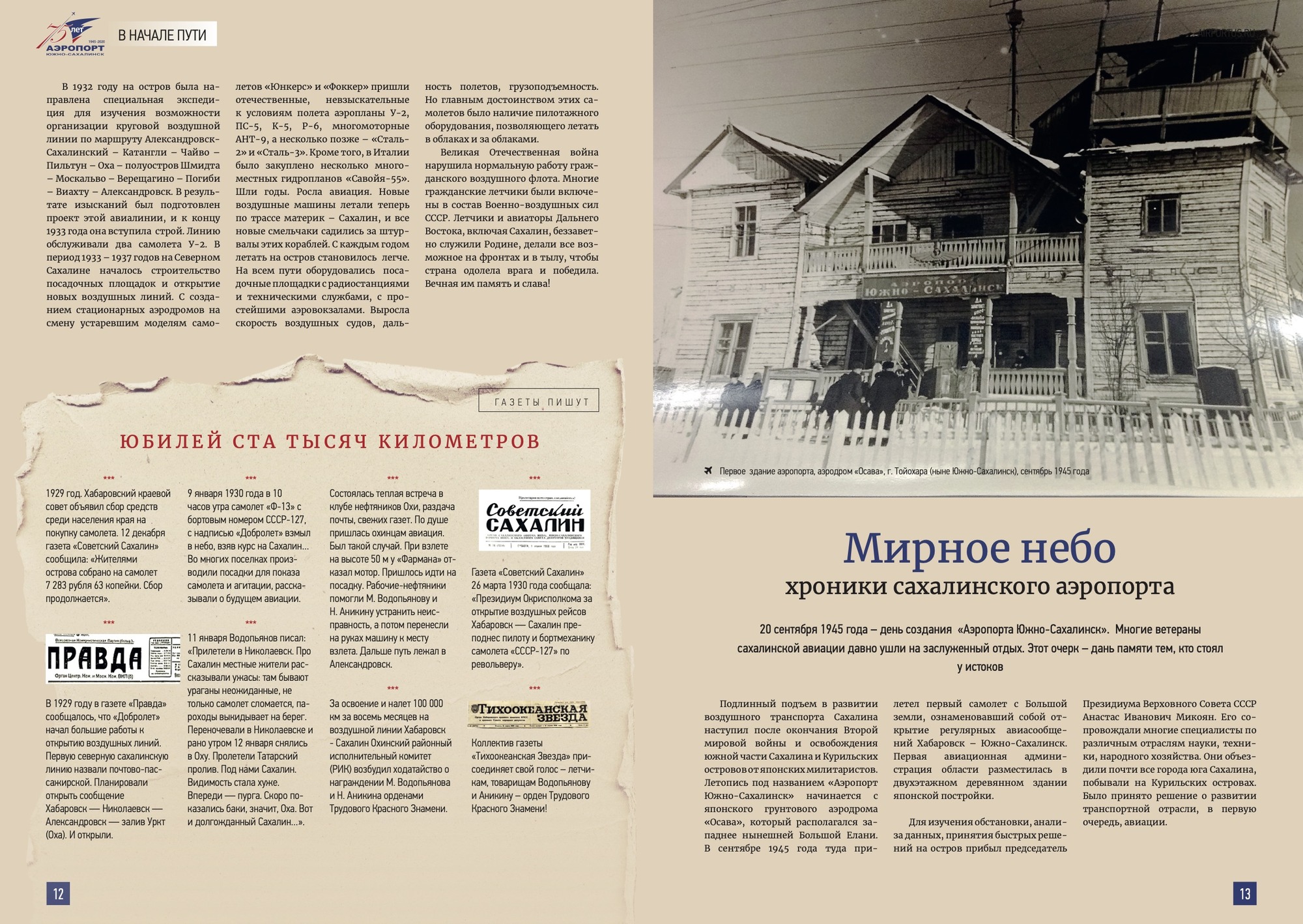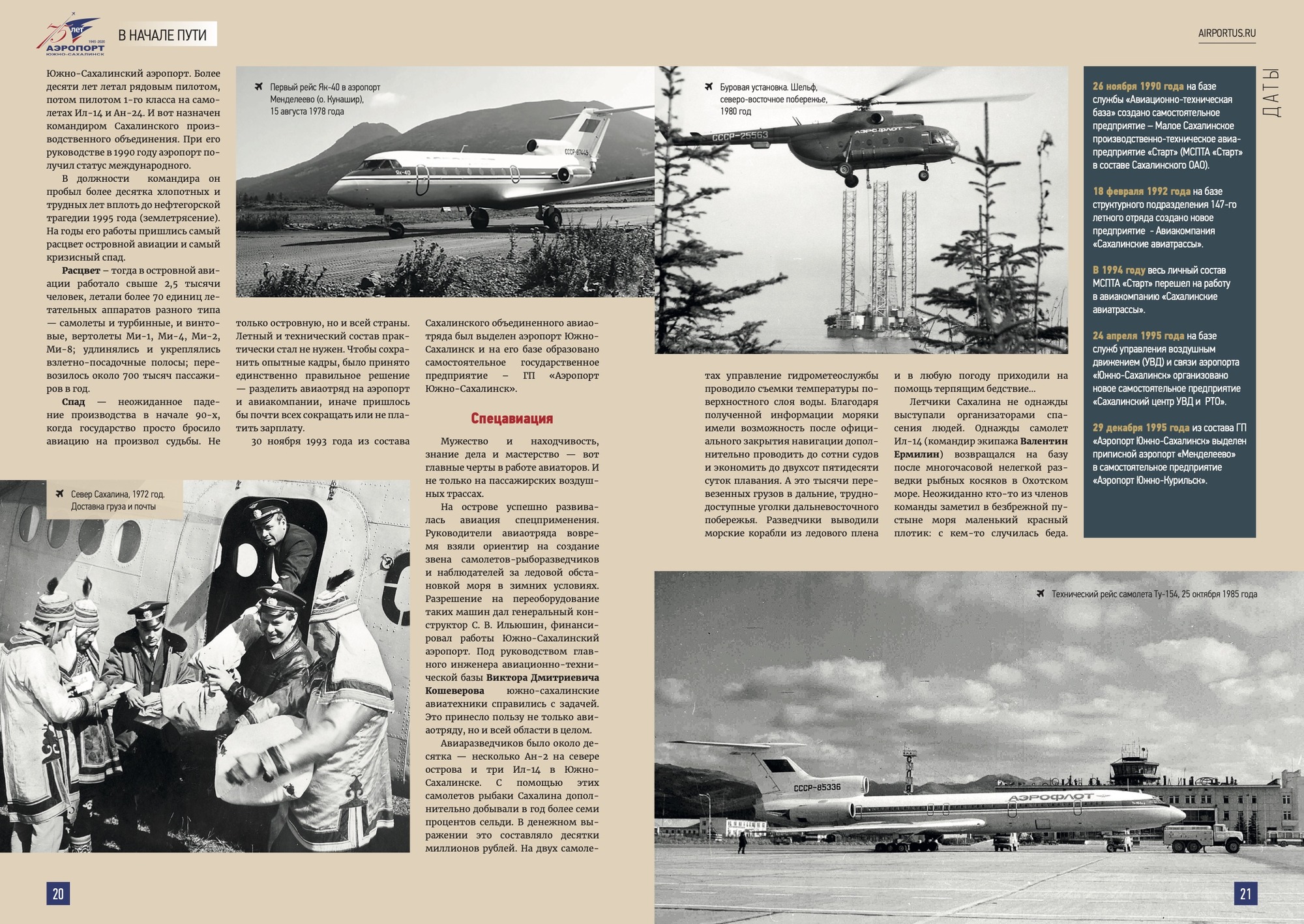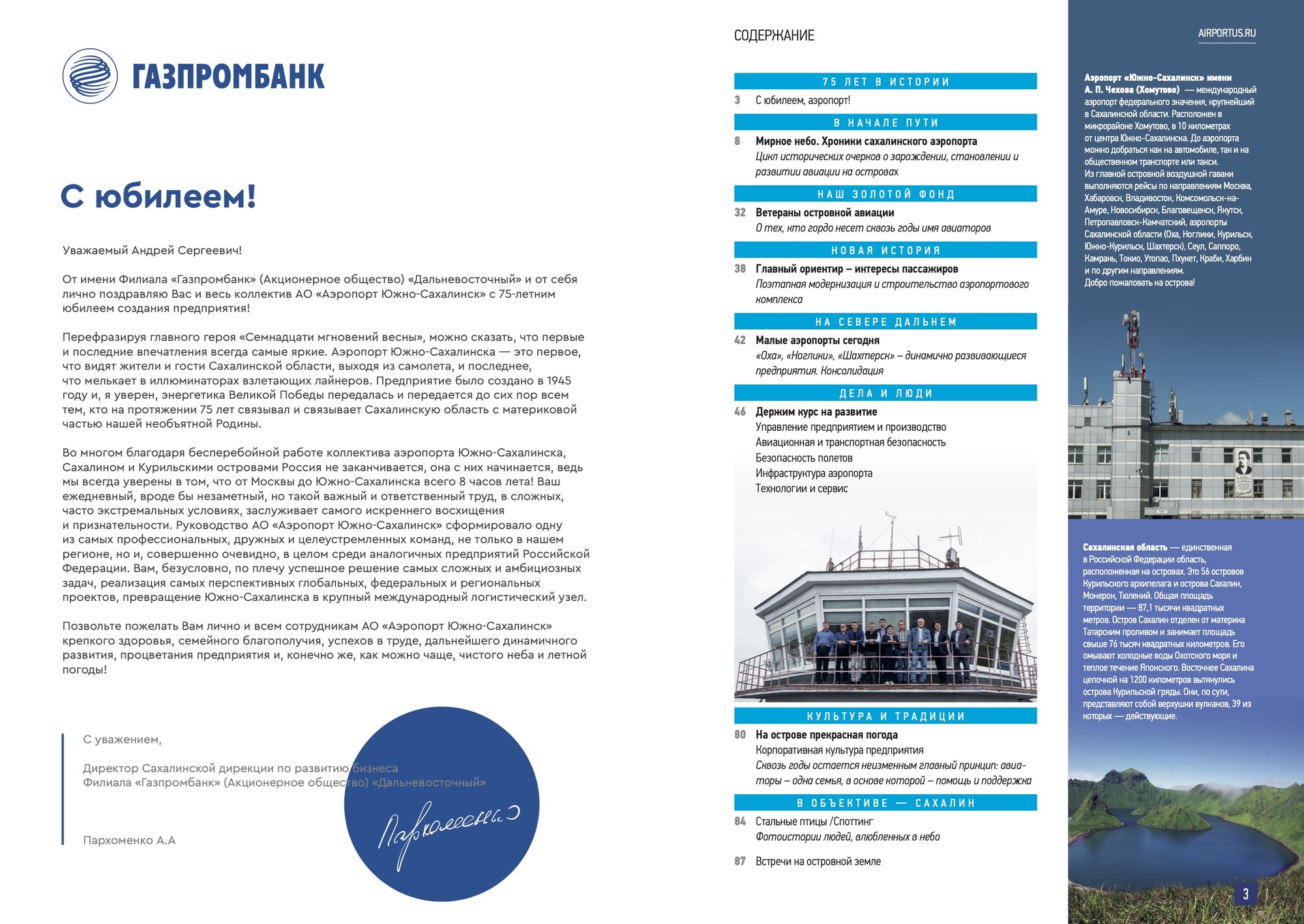В этом выпуске опубликована первая редакция истории развития и становления гражданской авиации на Сахалине, в лицах представлены подразделения АО «Аэропорт Южно-Сахалинск», а также событийный ряд аэропортовой деятельности и социальной жизни коллектива.
