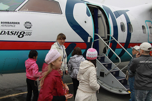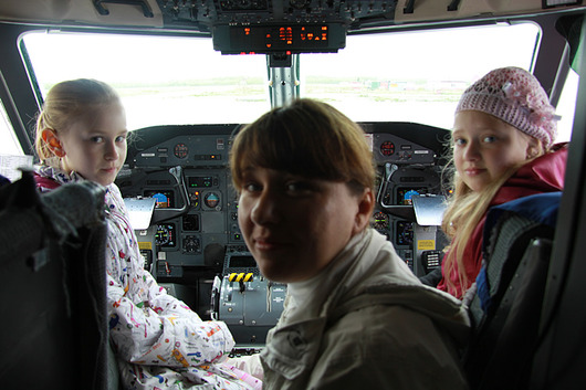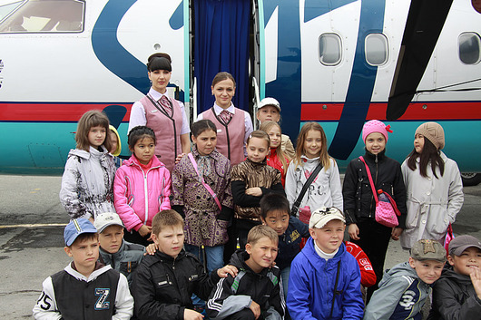 Конфеты и лимонад из рук профессионалов‐бортпроводников — этот традиционный приятный сюрприз ждал юных школьников в салоне самолета. Участие в проведении экскурсии принимала единственная женщина‐пилот в авиакомпании «САТ» Ольга Петрова (2-ой пилот, летает на Dash 8).