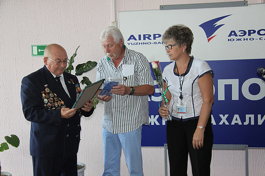 За многолетний добросовестный труд, высокий профессионализм от руководства ОАО «Аэропорт Южно‐Сахалинск» Почетной грамотой награждены: Бучок В.П. – инспектор‐контролер бюро пропусков, Гайворонский В.В. – начальник караула отдела охраны, Голубцова О.В. – инспектор по досмотру отдела досмотра, Григорьева Т.В. — инспектор по досмотру отдела досмотра, Демонова Т.А. – начальник отдела досмотра, Чернышов М.А. – инспектор группы перронного контроля и досмотра воздушных судов.