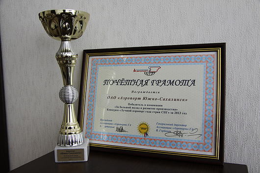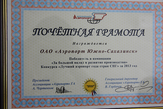По итогам работы за 2013 год в конкурсе Ассоциации приняли участие 22 аэропорта (Россия, Узбекистан, Молдова, Казахстан, Беларусь). В категории с ежегодным объемом перевозок 0, 5 — 1 млн. пассажиров ОАО «Аэропорт Южно‐Сахалинск» стал лауреатом в номинации «За большой вклад в развитие производства» по итогам работы за 2013 год.