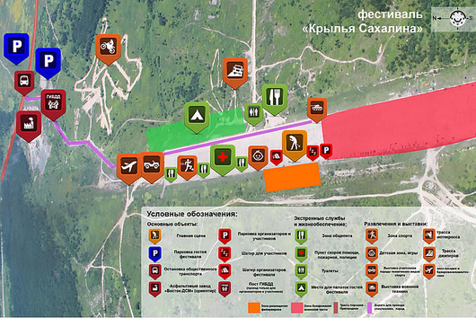 В связи с тем, что немалую часть бетонной ВПП на Пушистом заняли военные, организаторы «Крыльев Сахалина» решили сместиться на север. В том месте, где в прошлом году была парковка для гостей, теперь будет зона приземления и базирования авиационной техники. Для тех, кто беспокоится, что на фестивале «будет тесно», еще раз публикуем схему и уточняем — места хватит для всех!