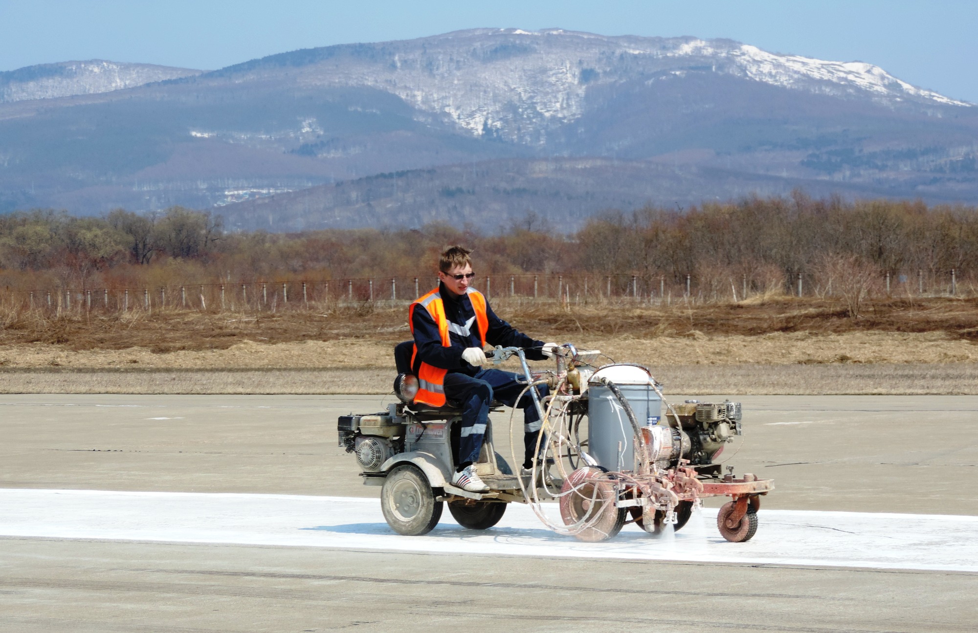 Особое внимание в конце мая‐начале июня специалисты подразделения уделяют нанесению маркировки (а проще говоря – разметки) на искусственные покрытия всех элементов летного поля. Такие мероприятия проводятся не менее двух раз в год: весной и осенью. Эти работы сотрудники аэродромной службы выполняют с почти ювелирной точностью – линии должны быть идеально ровными, без подтеков и нахлёстов. Во время беседы Эдуард Орехов приводит довольно интересный факт: чтобы отмаркировать только взлетно‐посадочную полосу южно‐сахалинского аэропорта необходимо порядка трех тонн краски! И это не считая нанесения разметки на территории стоянок воздушных судов, рулежных дорожек, путей движения спецтранспорта.