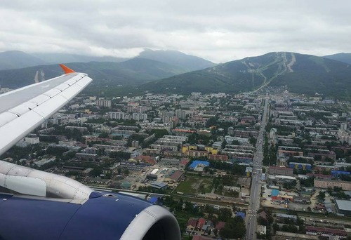 Далее в зависимости от ветра командир, зная курс посадки, приступает к снижению. С севера открывается потрясающий вид на остров. Ильинское, Томари практически под крылом, вдали на восточной части скала Тихая и Южнее Взморье в вечно спящей в тумане сопке. Еще буквально 5 минут и весь город как на ладони. Видна каждая улица, ставшего уже родным, Южно‐Сахалинска. Летишь и смотришь на железнодорожный вокзал, памятник Ленину, комплекс «Горный воздух» на вершине горы Большевик… Затем снижение вдоль улицы Ленина, объездной дороги, после чего происходит мягкое касание на капитально отстроенную полосу. Если заход с юга, то в полете вашему взору открываются красоты Монерона, залива Анива. Любуйтесь, наслаждайтесь и получайте удовольствие от включенной в ваш билет экскурсии над островом.