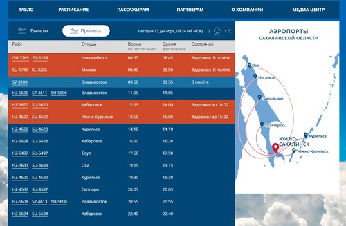 Рейс авиакомпании "Аэрофлот" № 1742 Москва-Южно-Сахалинск и рейс а/к "Глобус" № 3269 Новосибирск - Южно-Сахалинск ушли на запасной аэродром в Хабаровск.