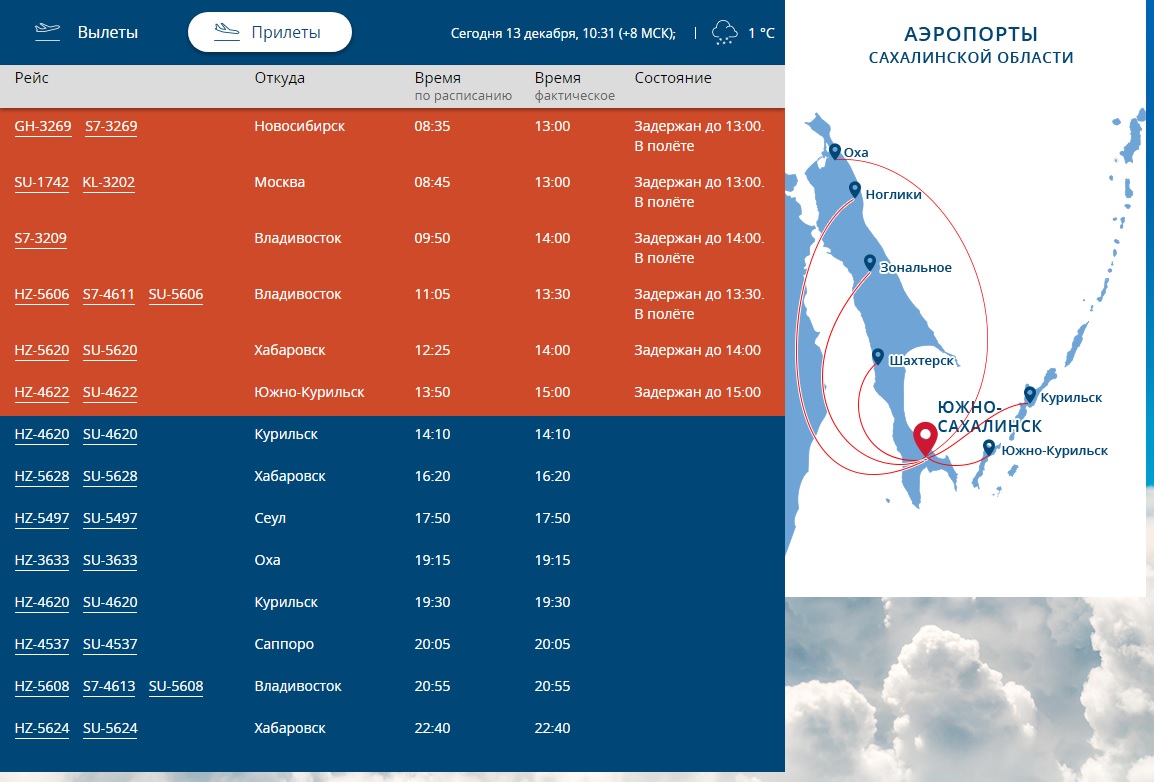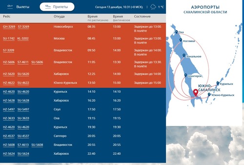 По прогнозу Росгидромета днем 13 декабря в районе аэродрома «Южно-Сахалинск» ожидается мокрый тяжелый снег и низкая видимость, ухудшение погодных условий.