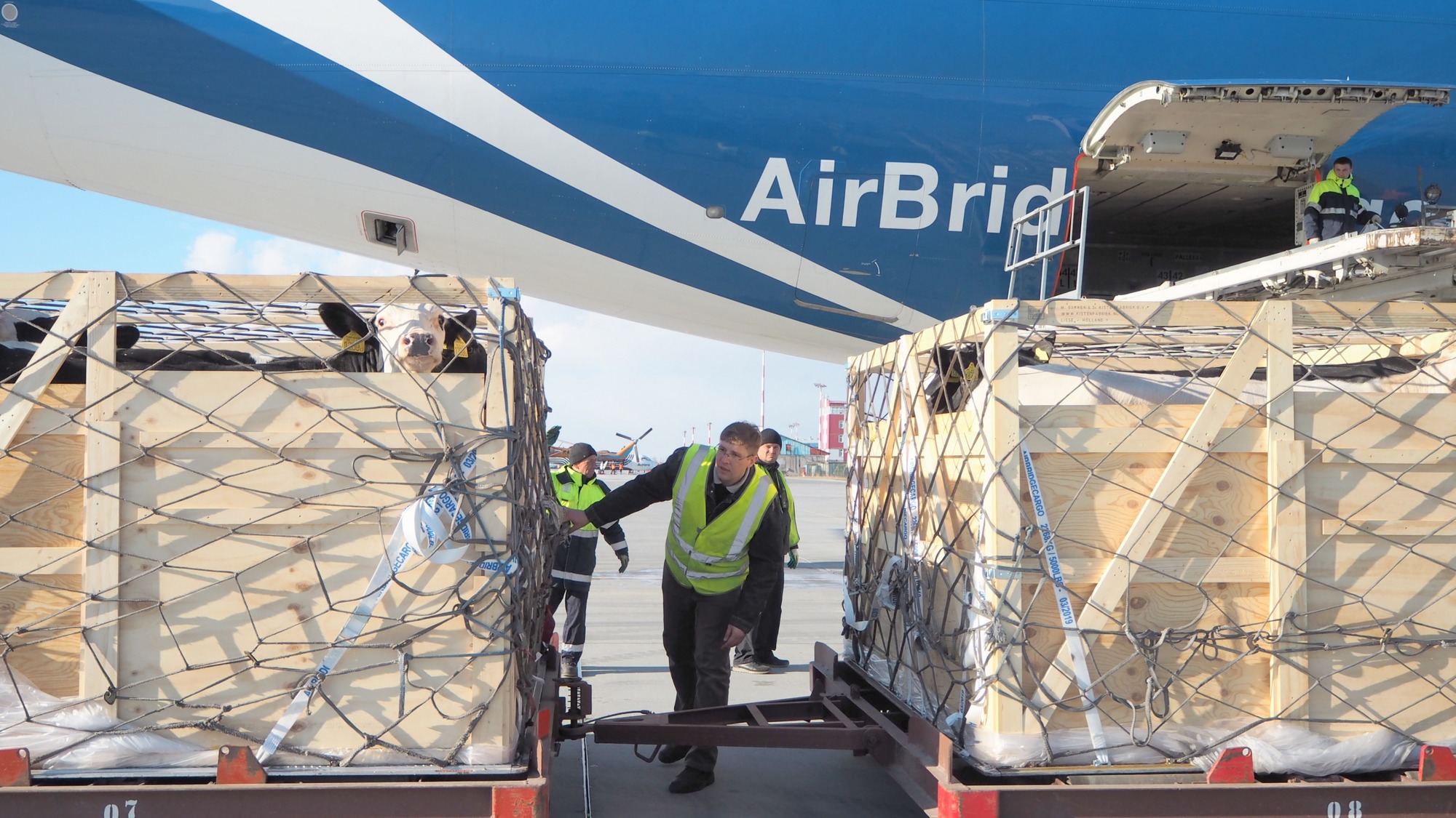 Прямым рейсом из Будапешта на остров привезли партию венгерско-голландских коров. Доставил почти 200 племенных нетелей голштинской породы в аэропорт «Южно-Сахалинск» Боинг-747-8F крупнейшей Российской грузовой авиакомпании AirBridgeCargo.