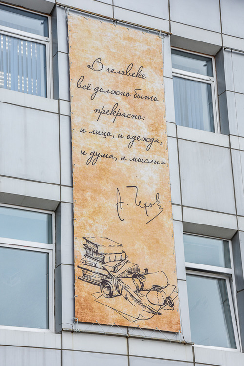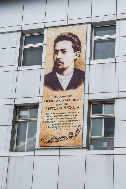 На главных воздушных воротах островного региона размещены рекламные баннеры, символизирующие присвоение аэропорту "Южно-Сахалинск" имени великого русского писателя А. П. Чехова. Отразить облик классика в существующем аэровокзале руководство аэропорта «Южно-Сахалинск» запланировало сразу, как только стали известны результаты всенародного голосования конкурса «Великие имена России». До публикации официального распоряжения о переименовании за подписью Президента страны, в воздушной гавани обсуждали идеи интеграции нового имени в облик действующего и строящегося аэровокзалов.