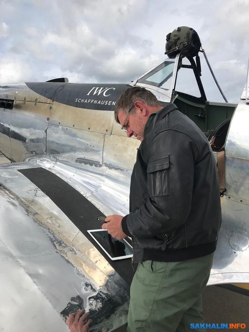 Пилота зовут Ян Смит. Восемь недель назад он вылетел из Лондона, чтобы совершить кругосветное путешествие. Через несколько недель он планирует приземлиться в аэропорту вылета. Сегодня на Сахалине его самолет сел на дозаправку и далее отправляется в Японию.