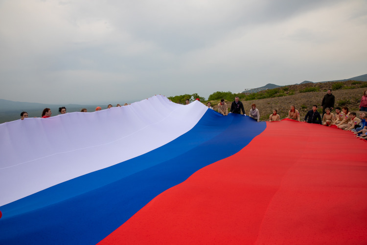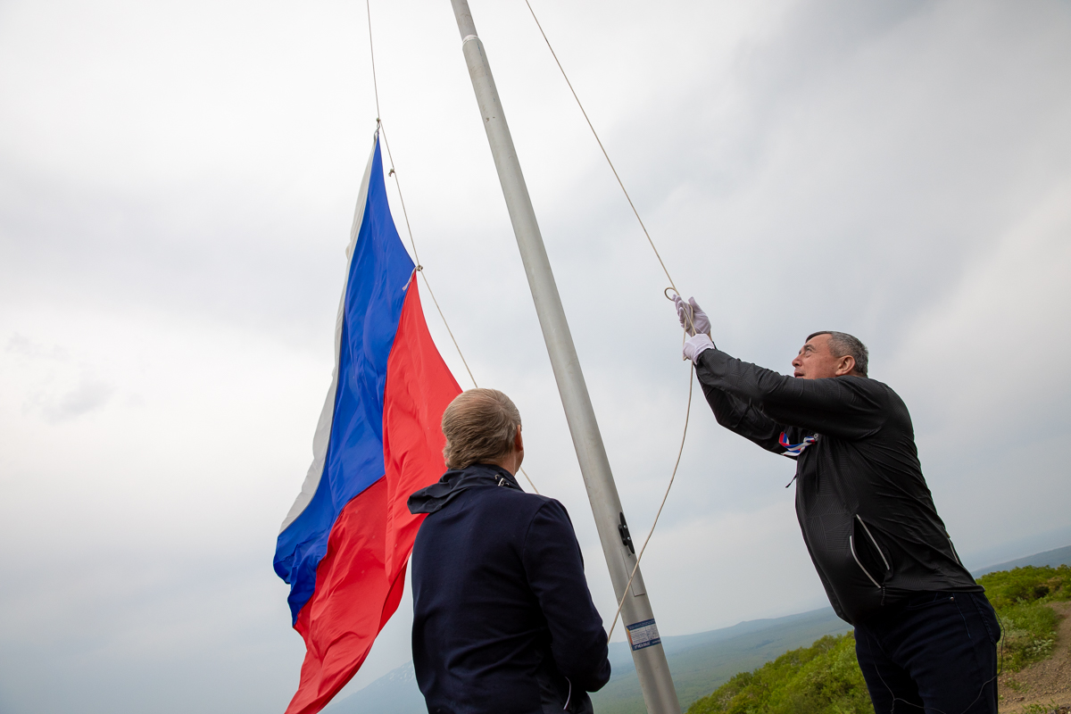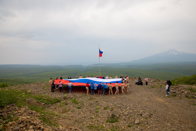 В честь Дня России на смотровой площадке вулкана Баранского растянули российский триколор размером 9 на 12 метров. В патриотической акции приняли участие губернатор Валерий Лимаренко и более 50 курильских школьников.