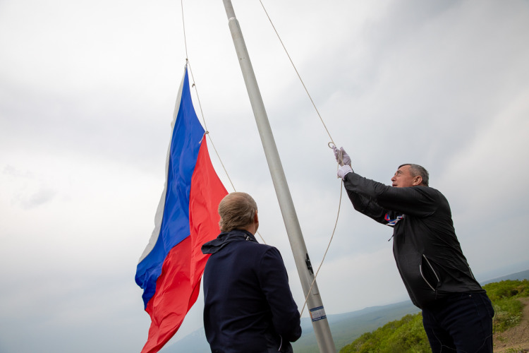 Вместе с губернатором патриотическую акцию поддержали юные активисты из Курильска и сел района. Флаг на вулкане развернули волонтеры, ребята из всероссийского военно-патриотического движения «Юнармия».