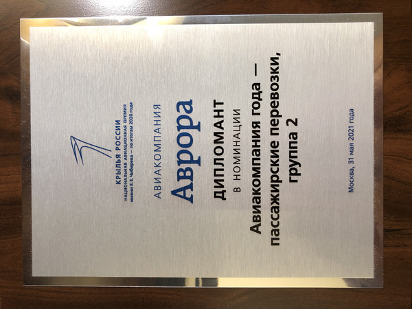 Авиакомпания «Аврора» стала дипломантом престижной авиационной премии «Крылья России» в номинации «Авиакомпания года – пассажирские перевозки, группа 2» по итогам 2020 года.