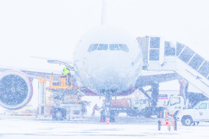 В аэропорту выведено на работу 14 единиц спецтехники. Влияние на график движения воздушных судов оказывает сильный боковой ветер, порывы которого достигают 20 м/с и отсутствие видимости (200 м по состоянию на 16.00).