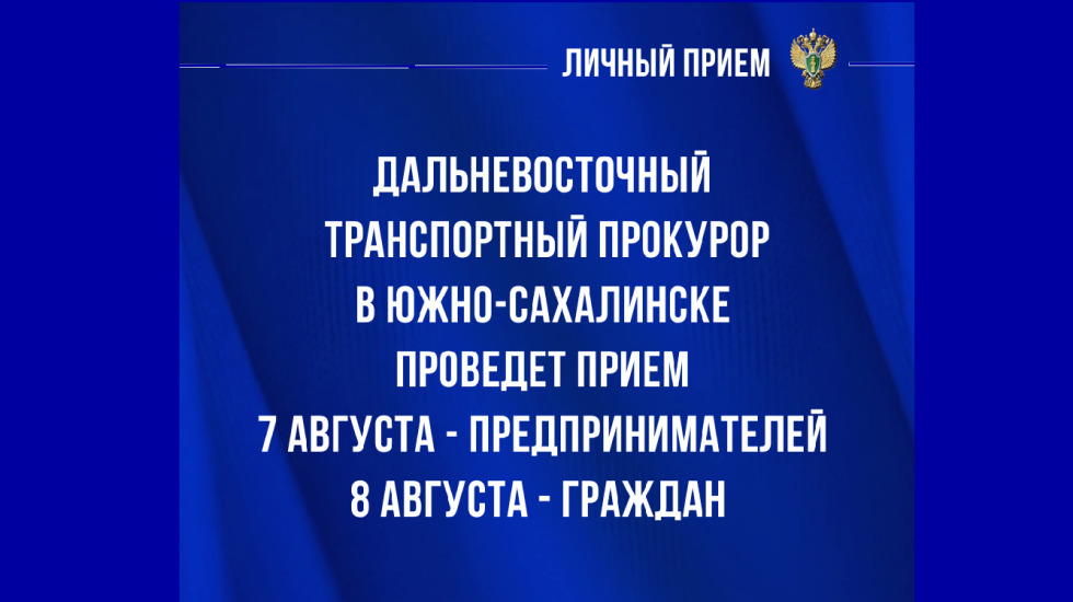 Дальневосточный транспортный прокурор Александр Воронин в г. Южно-Сахалинске проведет выездные приемы по вопросам исполнения законов в сфере деятельности воздушного, водного и железнодорожного транспорта, соблюдения требований таможенного законодательства, а также при осуществлении оперативно-розыскной и уголовно-процессуальной деятельности правоохранительными органами на транспорте.