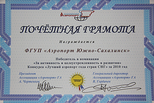 Аэропорт «Южно‐Сахалинск» второй год подряд становится призером в конкурсе «Лучший аэропорт года стран СНГ», это является признанием предпринятых командой ФГУП «Аэропорт Южно‐Сахалинск» усилий для развития аэропортовой инфраструктуры и для улучшения качества обслуживания пассажиров.